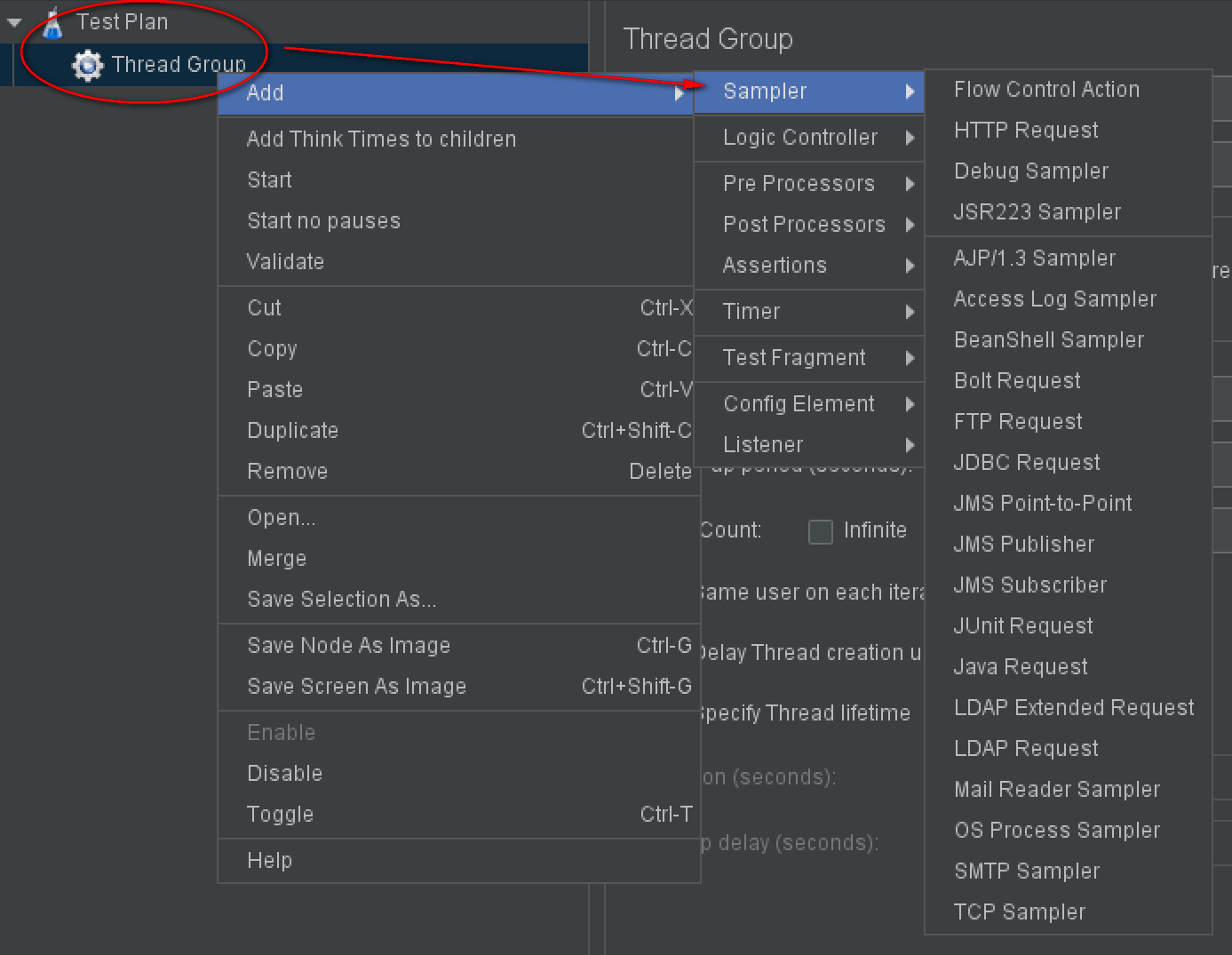 通过访问 测试计划|线程组|取样器 添加 Sampler。