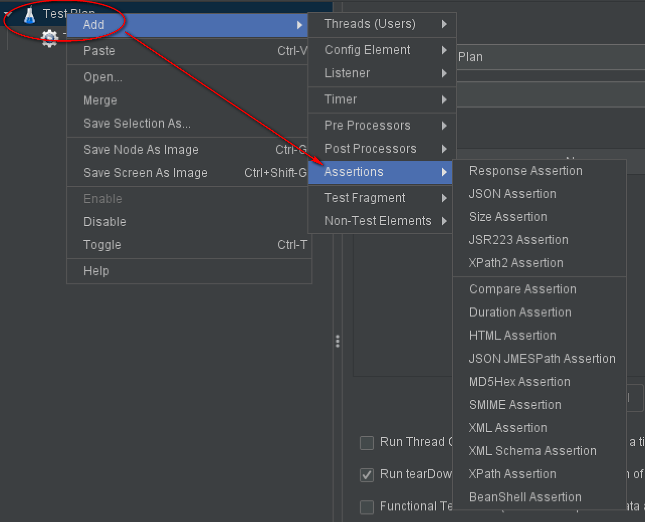 通过 测试计划|断言 添加 Assertions。线程组也能添加断言。