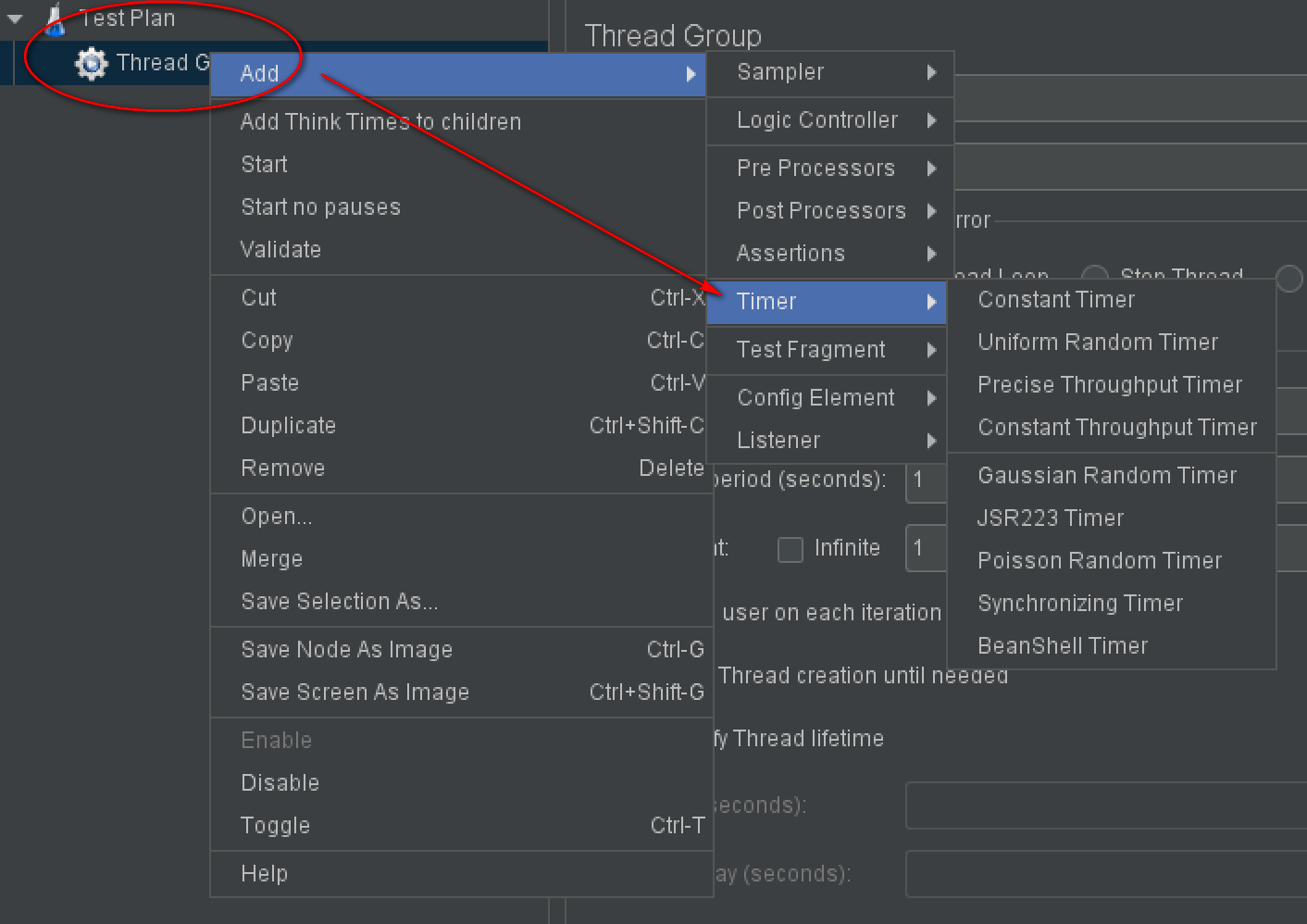 可以通过 测试计划|线程组|定时器 添加 Timer。