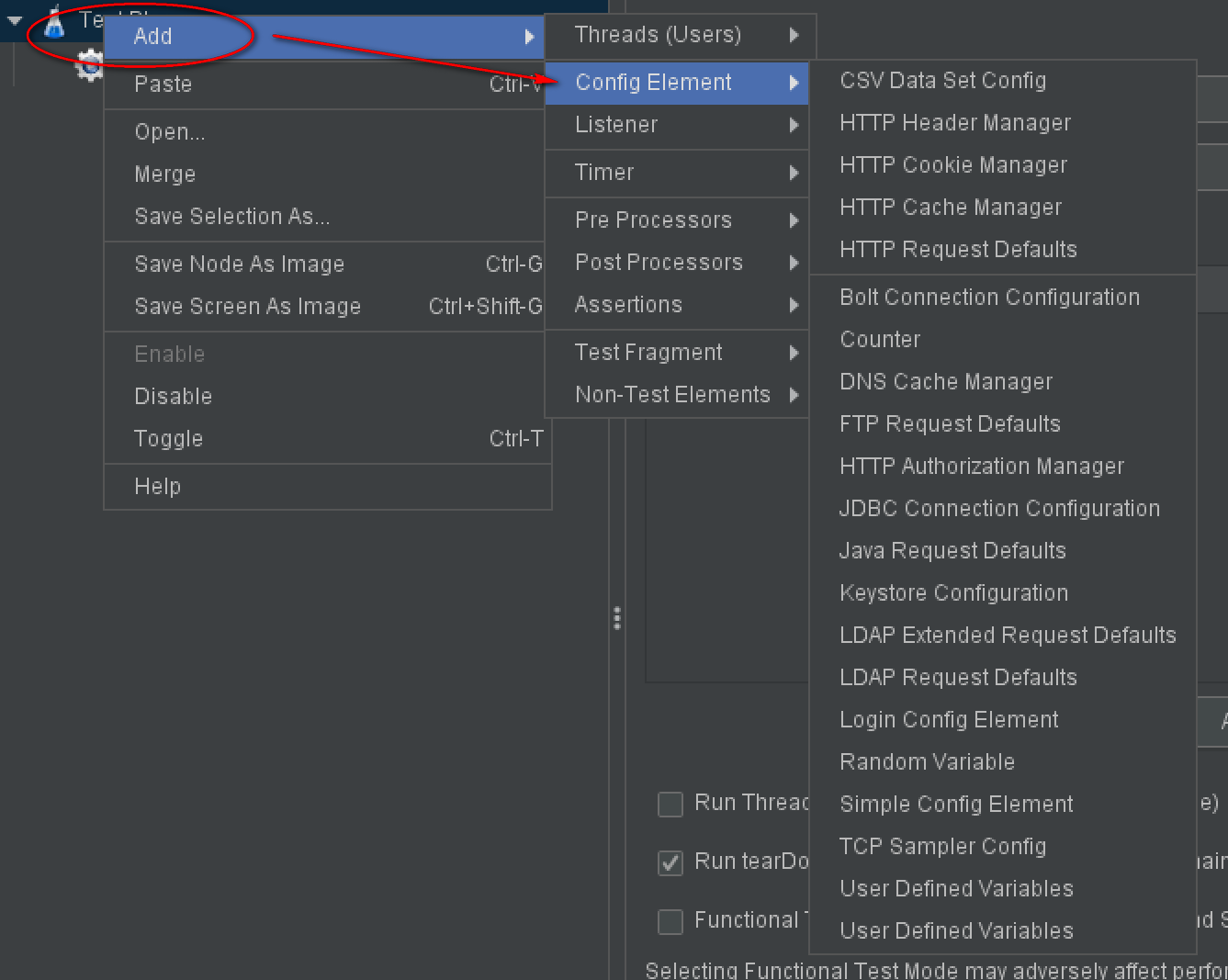 可以通过 测试计划|配置元件 添加 Config Element。线程组也可以添加配置元件。