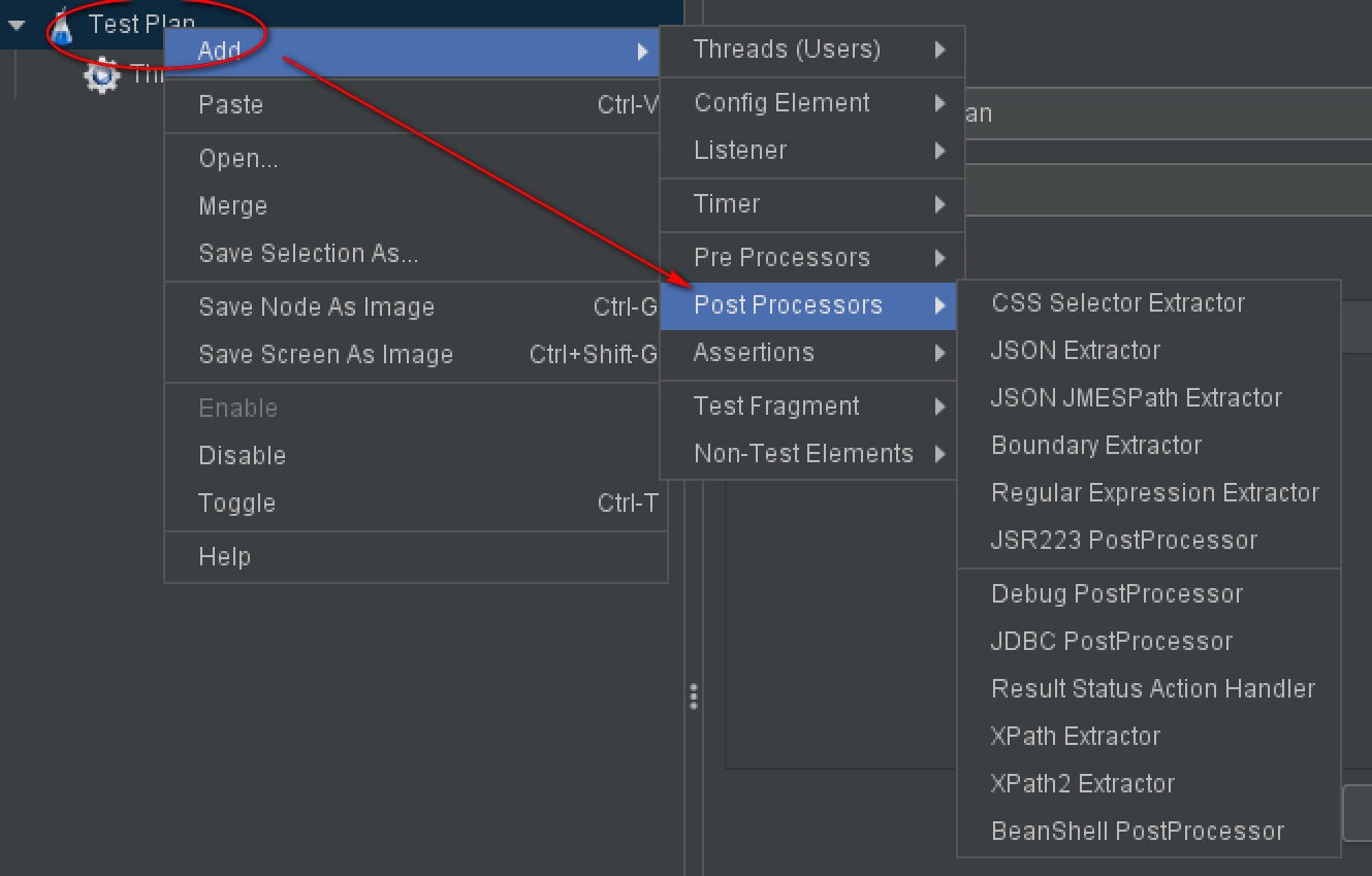 可以通过 测试计划|后置处理器 添加 Post Processors。线程组也可以添加后置处理器。
