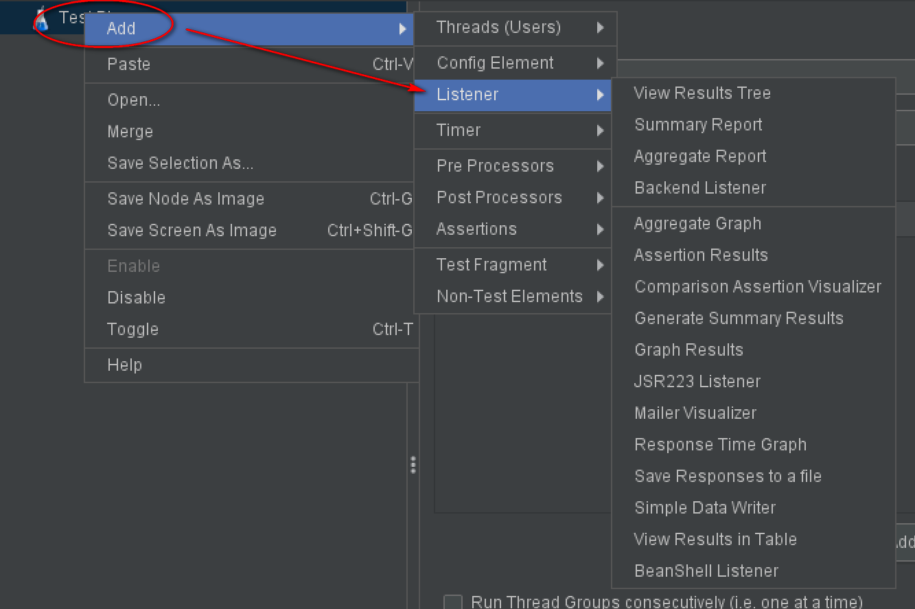 通过 测试计划|监听器 添加 Listener。线程组也可以添加监听器。