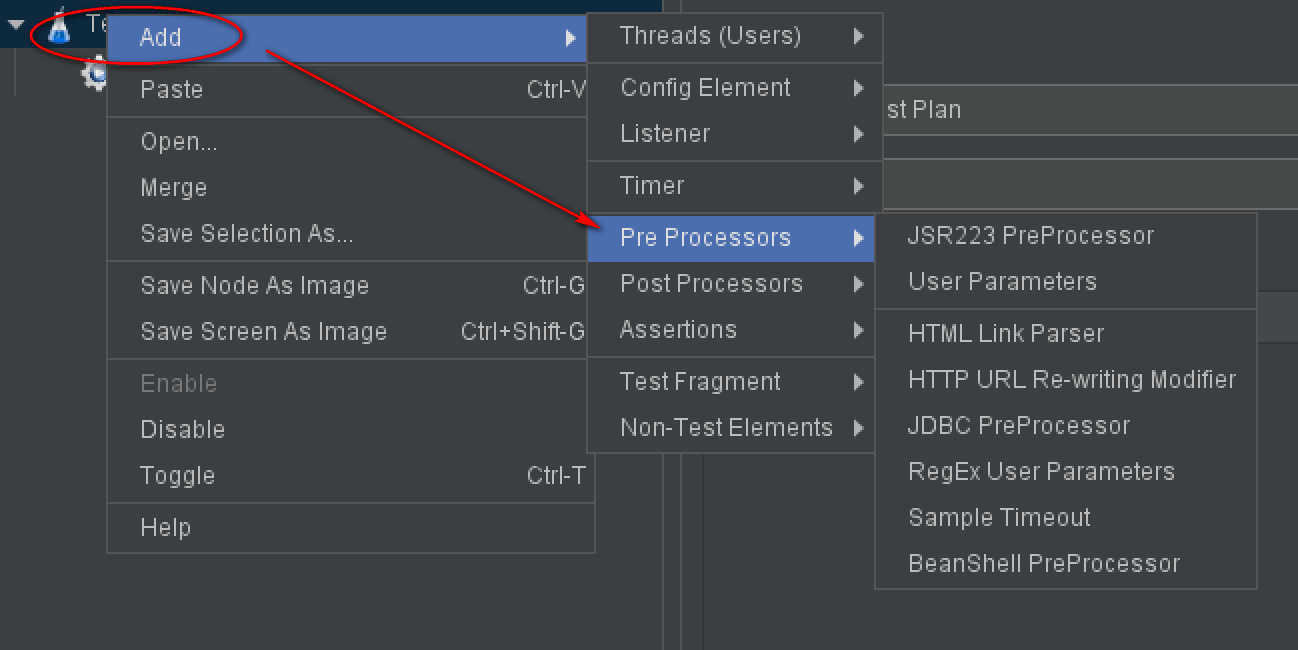 通过 测试计划|前置处理器 添加 Pre Processors。线程组也可以添加前置处理器。