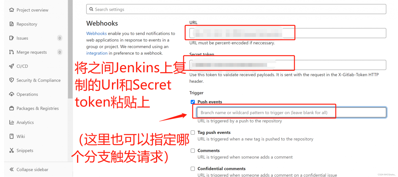 3.2)将之间Jenkins上复制的Url和Secret token粘贴上(详见2.3中(4)和(6))