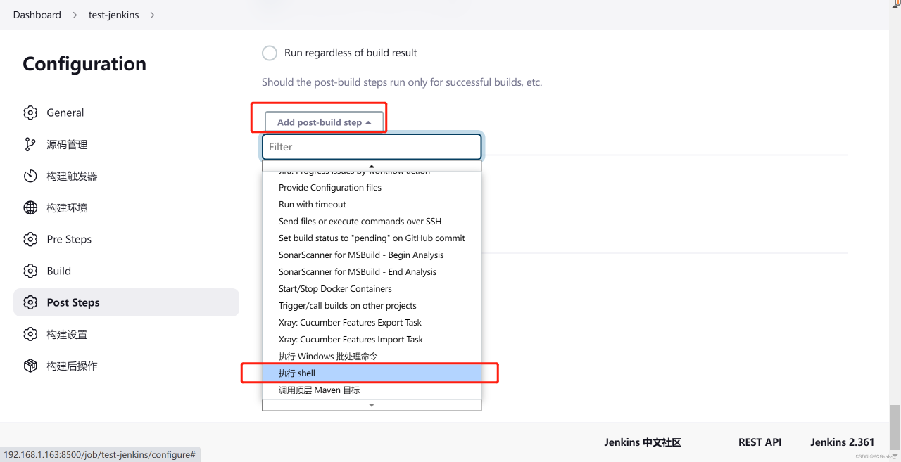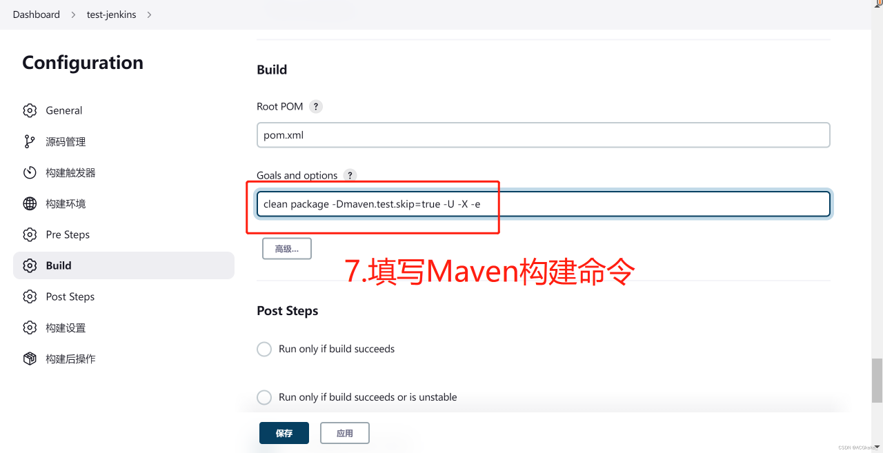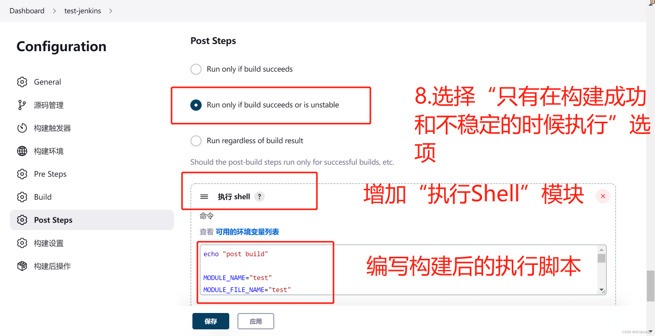 (8)Post Steps,选择“只有在构建成功和不稳定的时候执行”选项,增加“执行Shell”模块,编写执行脚本。