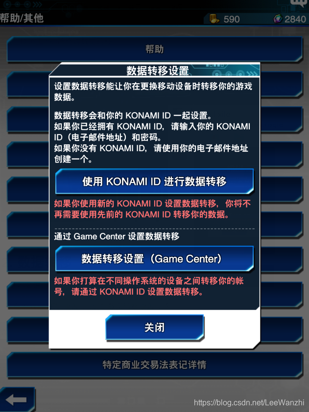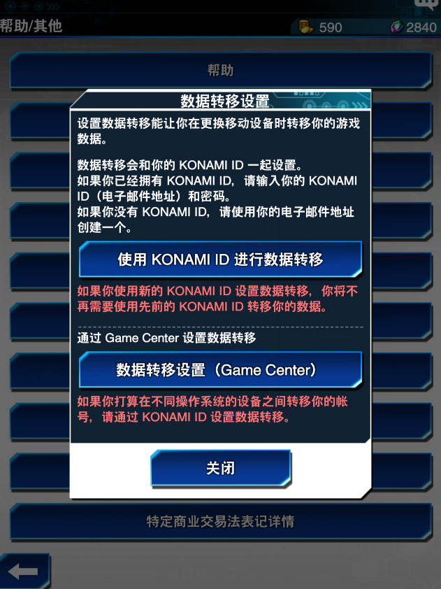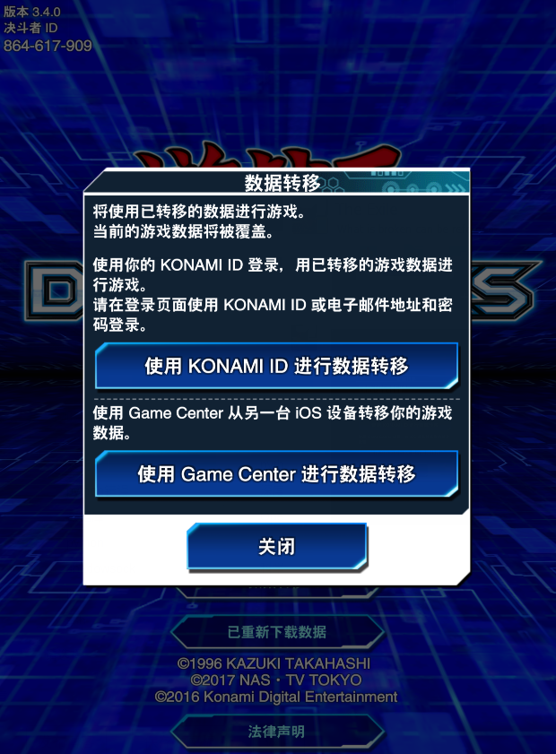 (2) 在新设备上,打开游戏(但不开始游戏),在初始界面上,点击数据转移,选择第一个"使用KONAMI ID进行数据转移"