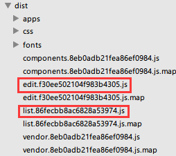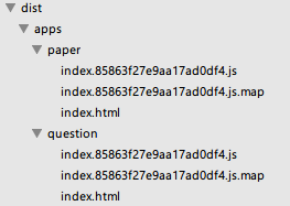 webpack打包后的目录是很乱的,如果你入口文件的名字取为question,那么会在dist目录下直接生成一个question.xxxxx.js的文件。但是如果把名字取为apps/question/index这样的,则会生成对应的目录结构。我是比较喜欢构建后的目录也有清晰的结构的,可能是习惯gulp的后遗症吧。这样也便于我们在前端路由中进行统一操作。也是一个小技巧吧,我生成的各入口文件的目录如下: