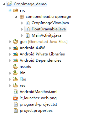 思路:在一个自定义View上绘制一张图片(参照前面提到的另一篇博文),在该自定义View上绘制一个自定义的FloatDrawable,也就是图中的浮层。绘制图片和FloatDrawable的交集的补集部分灰色阴影(这个其实很简单,就一句话)。在自定义View的touch中去处理具体的拖动事件和FloatDrawable的变换。图片的绘制和FloatDrawable的绘制以及变换最终其实就是在操作各自的Rect而已,Rect就是一个有矩形,有四个坐标,图片和FloatDrawable就是按照坐标去绘制的。