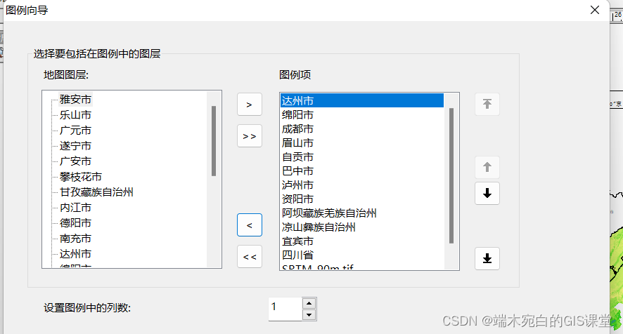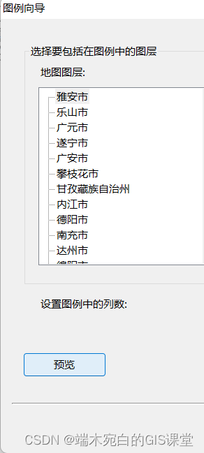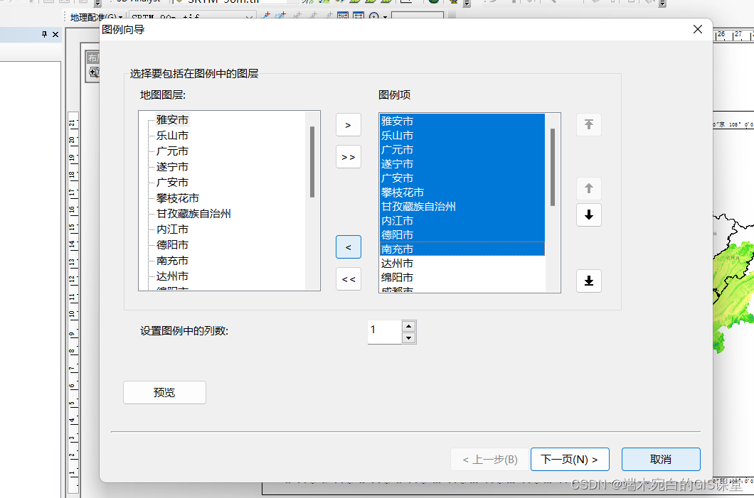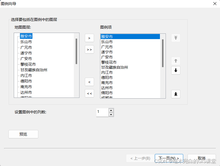 2、图例向导第一页中,地图图层就是加载进来的数据,不论矢量还是栅格数据只要,属于打开状态,那么都会默认到图例中,也就是地图图层和图例项本身是默认对应的。但是可以进行选择,需要哪些图层显示出来并且制作为图例,可以选择。