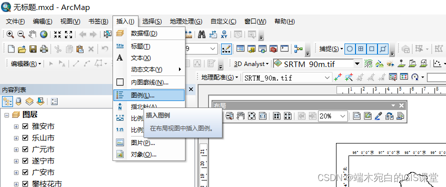 1、插入图例,和比例尺是一样的,软件最顶部的插入找到图例插入。