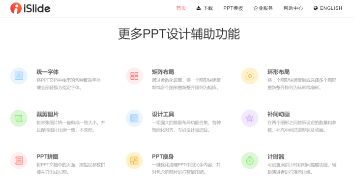 有了iSlide插件,不懂设计也能做出专业PPT。iSlide的功能非常丰富,有统一字体、矩阵布局、环形布局、裁剪图片、设计工具、补间动画、PPT拼图、PPT瘦身和计时器等等。