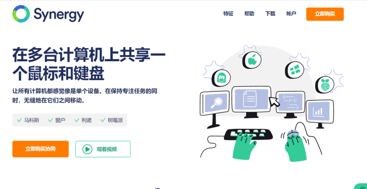 Synergy允许你轻松地在你办公桌上多台计算机之间共享你的鼠标和键盘。你只要将鼠标(指针)从一台计算机的屏幕边缘移出到另 一个屏幕就行了。甚至可以共享你的剪贴板。你所需要的仅仅是一个网络连接。Synergy是跨平台的,支持Windows,MacOS和Linux。