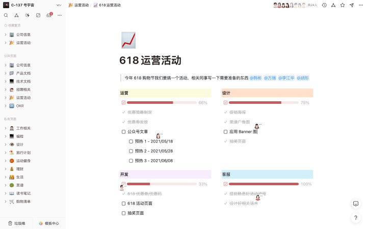每个信息块可以包括任何内容,文字、表格、图片、视频、待办列表等等,它们可以被简易编辑、移动,经实时呈现后组成页面。