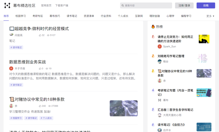 幕布还有精选社区,里面简直是个宝库,里面有各种笔记干货,比如:校园学习、考研专区、行业资料、互联网、编程学习等等。例如如何掌握一门新技能、自控力读书、极简项目管理读书笔记等等干货内容。