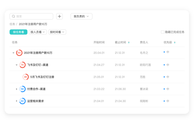 你还可以给目标设置目标量、完成量、责任人、参与人、目标计划和关联任务等等。管理层和员工可以在目标里面畅快沟通,以确定目标的设置和拆解,达成共识。