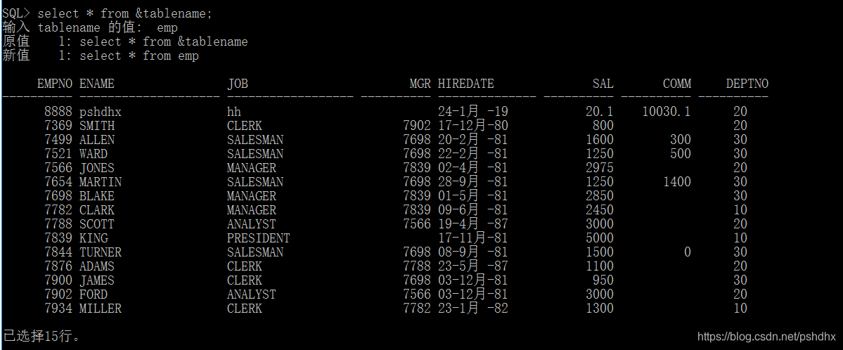 select * from &tablename; -- 自定义输入数据表的名称 |
