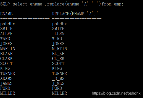 select ename ,replace(ename,'A','_')from emp; --字符串替换【序列号好像不行】 |