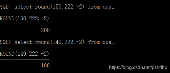 select round(111.222,-2) from dual; --整数部分回退两位,以50为界四舍五入。 |