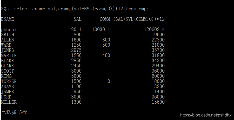 范例:要求计算emp表中每一位雇员的年薪 select ename,sal,comm,(sal+NVL(comm,0))*12 from emp; |
