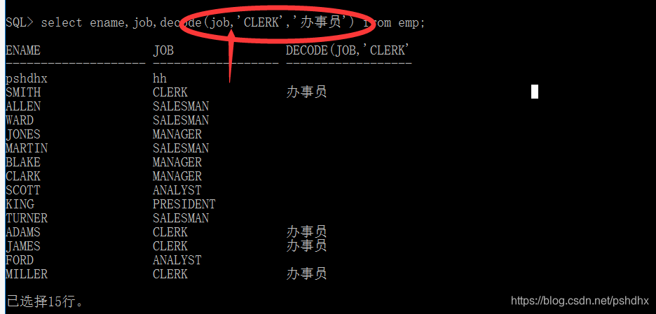 select ename,job,decode(job,'CLERK','办事员') from emp; |