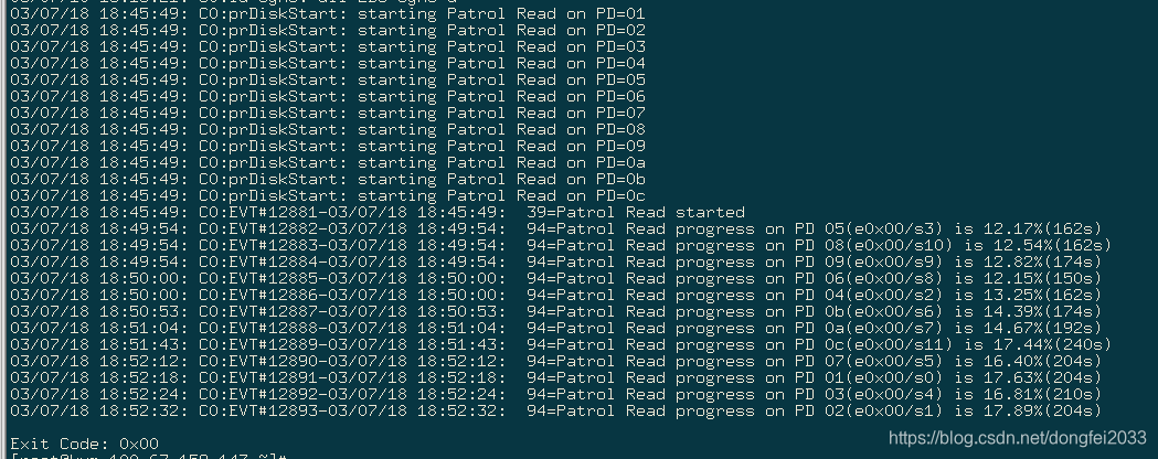12/23/14 17:50:10: prDiskStart: starting Patrol Read on PD=0012/23/14 17:50:10: prDiskStart: starting Patrol Read on PD=0112/23/14 17:50:10: prDiskStart: starting Patrol Read on PD=0212/23/14 17:50:10: prDiskStart: starting Patrol Read on PD=0312/23/14 17:50:11: EVT#03353-12/23/14 17:50:11: 39=Patrol Read started遇到Error後: