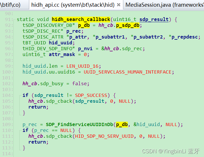 -->当SDP问询完成时,函数hidh_search_callback被执行,在此函数内部,可以看到其对获取的数据,针对UUID是0x1124的进行部分解析(但不解析报告描述符部分);