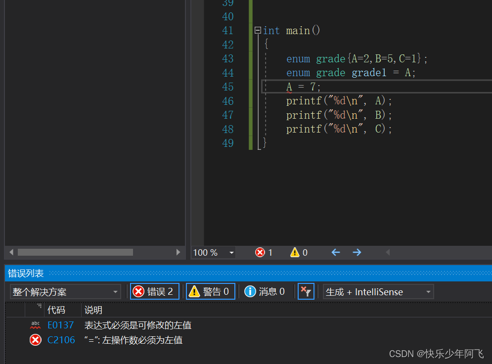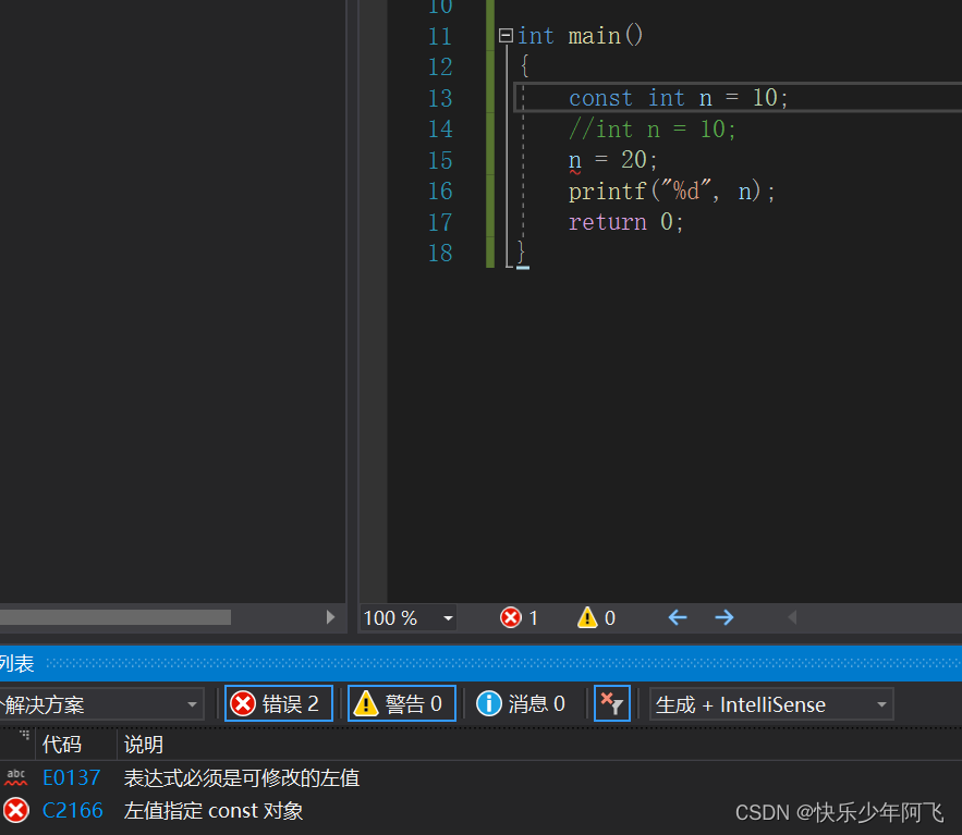 此处,const修饰的常变量它虽然拥有不能被改变的属性,但是它本质上仍然是一个变量。由于数组在定义时不能用变量来定义数组的大小,所以会报错,也揭示了此处的n本质上仍然是个变量: