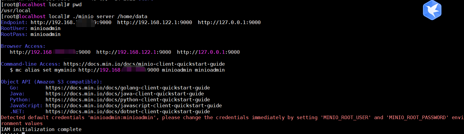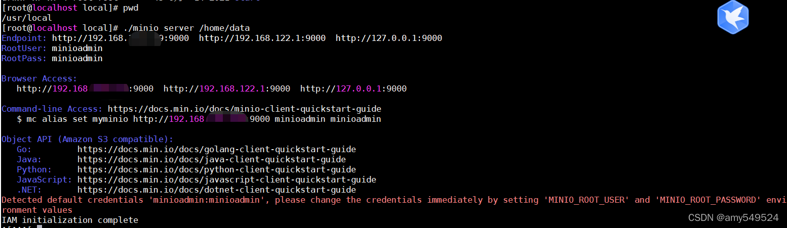 第三步:启动 /home/data是自己定义的文件路径,进入MinIO的安装目录执行./minio server /home/data