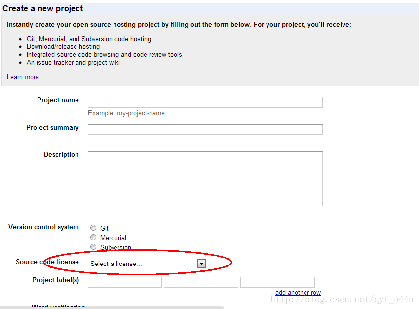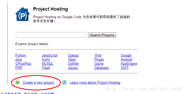 - 在url输入 http://code.google.com/intl/zh-CN/ ,打开网页后,最下方有个 create a new project。