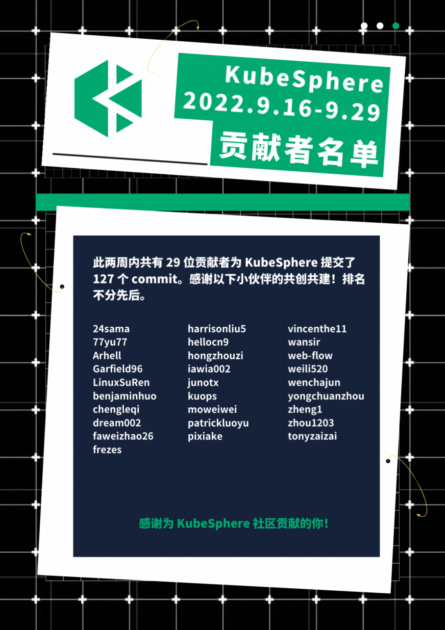 为了帮助社区的小伙伴们更好地掌握 KubeSphere 社区的进展,我们决定每两周更新一次周报,即双周报。本双周报主要是整理展示新增的贡献者名单,以及两周内提交过 Commit 的贡献者,并对近期重要的 PR 进行解析,同时还包含了线上 / 线下活动和布道推广等一系列社区动态。