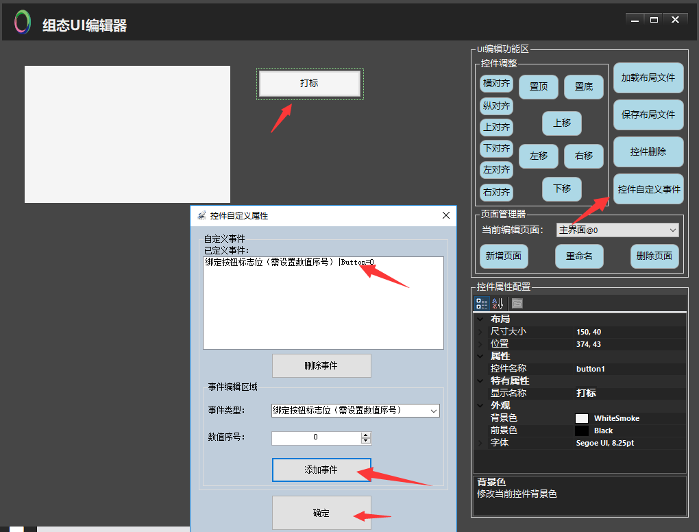 我们设置一个命名为pic1的图像框,然后配置一个按钮,值得注意的是需要设置按钮的“控件自定义事件”,如上图所示:点选按钮后,点击控件自定义事件,在弹框中选择“绑定按钮标志位”,这里我们设置数值序号为0,然后添加事件,确定保存事件即可,保存该UI布局文件。