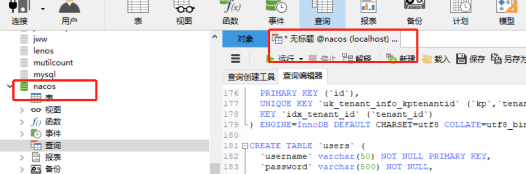 首先新建数据库nacos,可以在如下目录找到数据库脚本文件nacos-mysql.sql