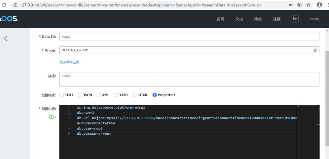 db.url.0=jdbc:mysql://127.0.0.1:3306/nacos?characterEncoding=utf8&connectTimeout=1000&socketTimeout=3000&autoReconnect=true