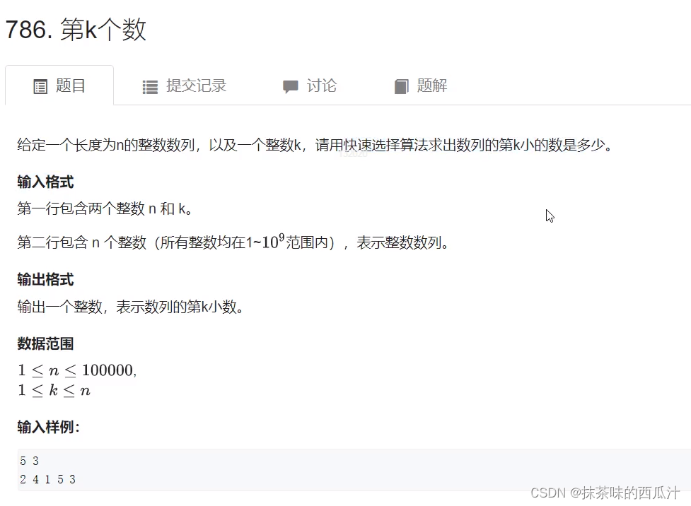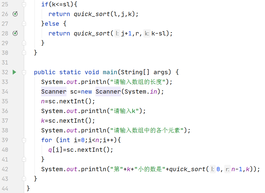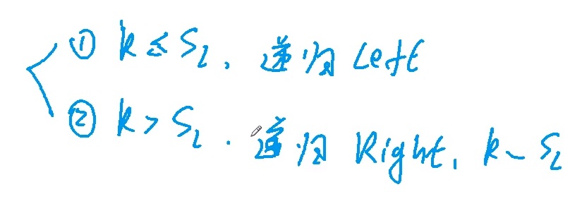 我们快速排序是要递归左边和右边的,但是我们这里是快选是不需要左边和右边都递归的 ,分成两种情况,假设我们的k是小于左边元素个数的,那么我们第k小的数一定在左边,所以只递归左边就可以了。如果k是大于左边元素个数的,那第k小的数一定在右边,只递归右边就行了,并且是取右边第k-sl小的元素。