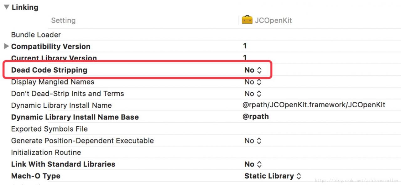3、将DeadCode Stripping设置为NO,网上对此项的解释如下,大致意思是如果开启此项就会对代码中的”dead”、”unreachable”的代码过滤,不过这个开关是否关闭,似乎没有多大影响,不过为了完整还原framework中的代码,将此项关闭也未曾不可。