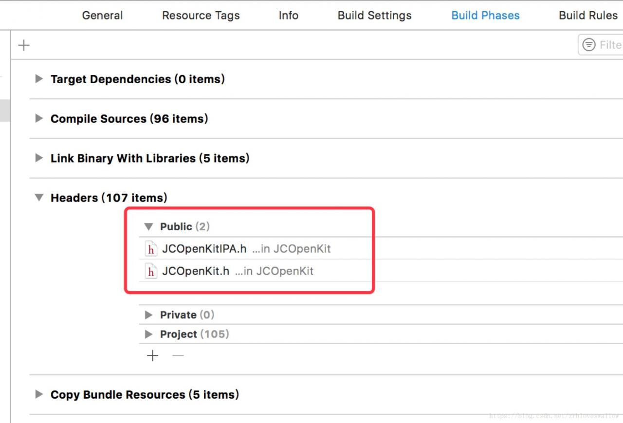 6、设置Headers,你要公开的头文件拖至Public下,要隐藏的放在Private或者Project下,当然,隐藏的头文件就无法再被引用。注意:如果公开的类中导入了非公开的类,则外部导入库文件后会报错,找不到对应的文件,需要将公开类中导入的类都公开