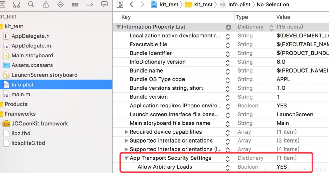 如果自定义库中有http的请求,则需要在主程序的Info.plist中加入以下设置,不然会请求失败
