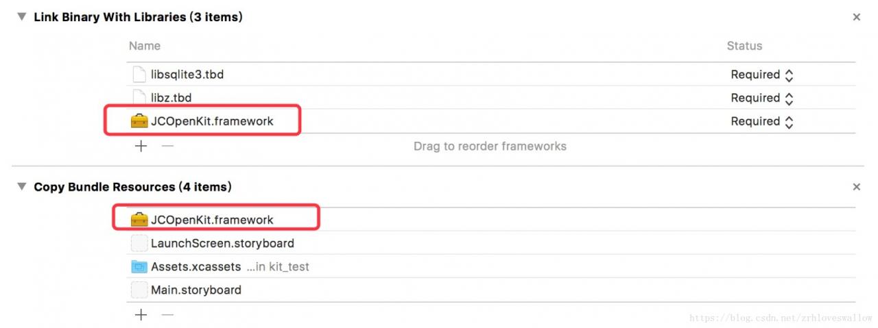 1)将.a、头文件以及.bundle添加到自己的库中,注意勾选Coby…和Add to target选项,完成后结果如图