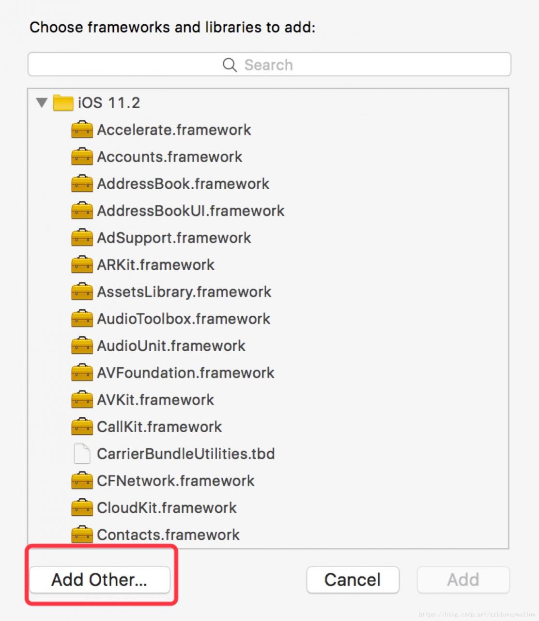 注意:添加所需要依赖的系统库,这里需要添加的.dylib如果使用新的.tbd编译会报错,简单的处理就是还替换添加.dylib的库<在Link BinarywithLibaraies中点击加号->AddOther...->Shift + Command + G组合键->输入/usr/lib->找到需要添加的库,具体步骤如下: