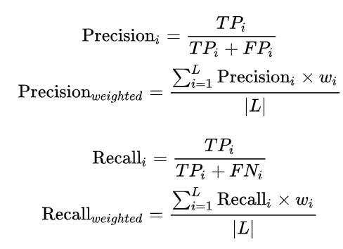 这种方式是在macro-F1的基础上考虑到类别不平衡的问题,假设有三类,样本数分别为c1,c2和c3,那么每一类的权重分别为ci/(c1+c2+c3),则precision的计算方式是每个类别的precision和其权重的加权平均,recall也同理,F1则直接由precision和recall计算得到。