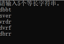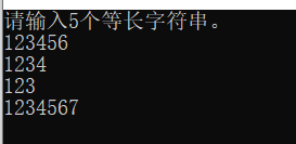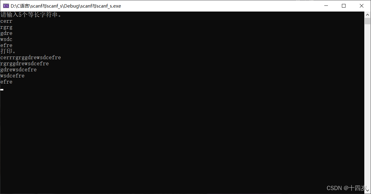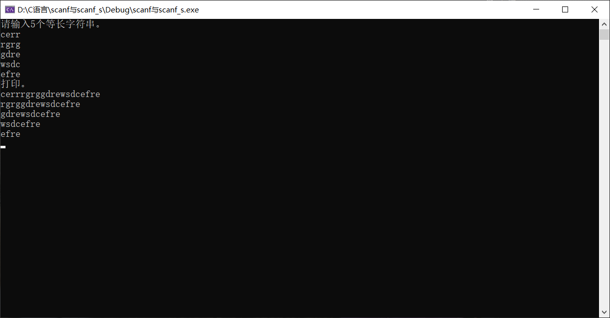 如果输入超过4个,scanf会视4个字符为一个字符串并将之置为空,余下的放入下一个数组视为新的字符串,不会像scanf那样一定要输入5次。效果如下: