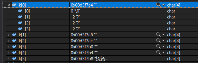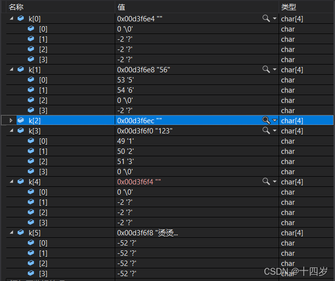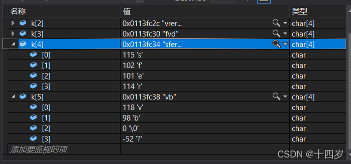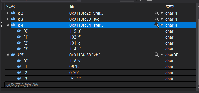 同样的,当输入字符串长度大于4时scanf函数仍然接收,无论字符串有多长,数组空间有多大,scanf函数都会接收并在最后置入\0表示字符串结束。当我最后输入sfervb时效果如下。