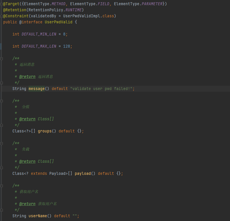 @Constraint(validatedBy = UserPwdValidImpl.class)加上注解指定实现校验逻辑的类,在这个类中要实现ConstraintValidator<A extends Annotation, T> 复写initialize isValid两个方法。