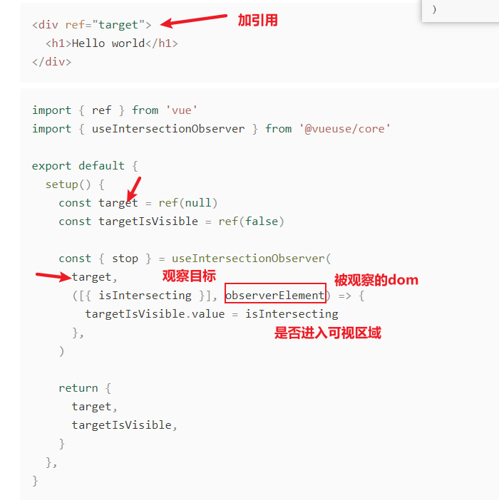 注意:useIntersectionObserver默认以进入视口的面积占总元素面积的0.1为基准判断是否进入