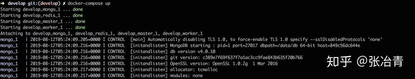 docker-compose up运行上述命令后,Docker Compose 会去拉取 MongoDB 和 Redis 的镜像,这可能会花几分钟时间。拉取完毕后,四个服务会依次启动,您将会在命令行中看到如下内容。