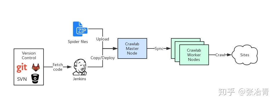 - 这样,每一次代码更新提交到代码仓库后,Jenkins 就会将更新后的代码发布到 Crawlab 里,Crawlab 主节点会将爬虫代码同步到工作节点,以待抓取。