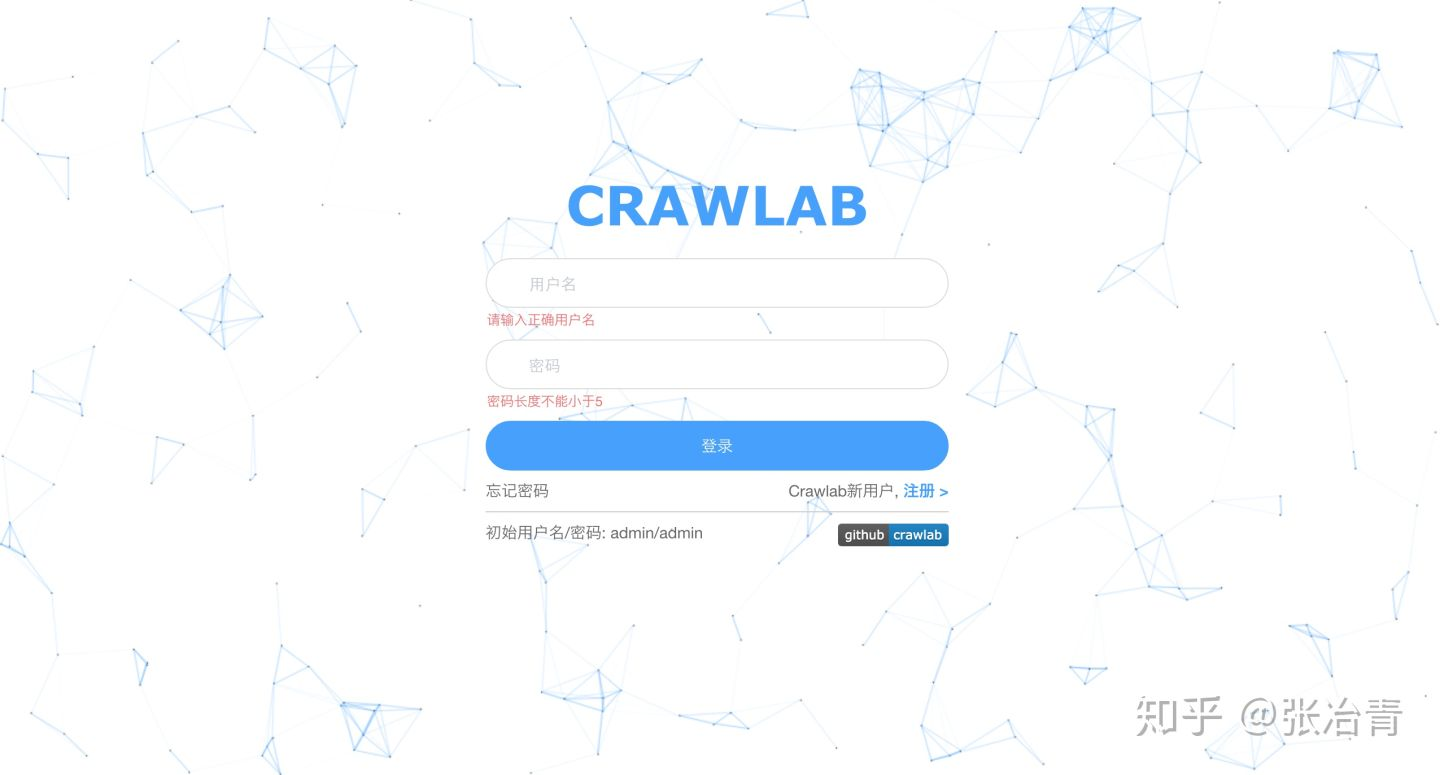 初始登陆用户名密码是 admin/admin,您可以使用这个用户名密码来登陆。如果您的环境变量CRAWLAB_API_ADDRESS设置得不正确,您可能会看到点击登陆后登陆按钮会一直转圈而没有任何提示。这时请重新在docker-compose.yml中设置正确的CRAWLAB_API_ADDRESS(将localhost替换为<your_ip>),重新启动docker-compose up。然后在浏览器中输入http://<your_ip>:8080。