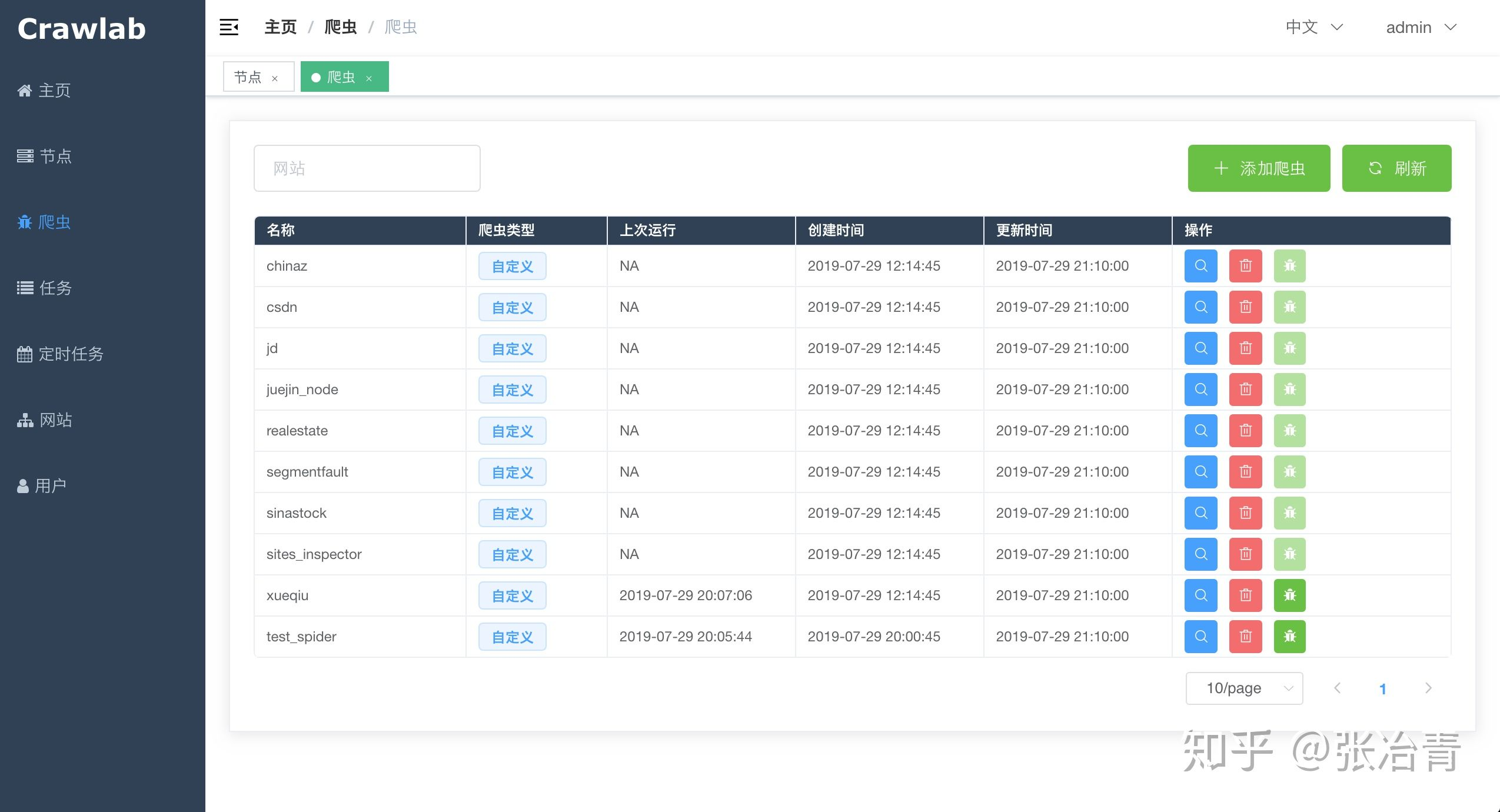 平台名称 | 技术 | 优点 | 缺点 :-- | :-- | :-- | :-- SpiderKeeper | Python Flask | 基于 scrapyd,开源版 Scrapyhub,非常简洁的 UI 界面,支持定时任务 | 可能有些过于简洁了,不支持分页,不支持节点管理,不支持 scrapy 以外的爬虫 | Gerapy | Python Django + Vue | Gerapy 是崔庆才大神开发的爬虫管理平台,安装部署非常简单,同样基于 scrapyd,有精美的 UI 界面,支持节点管理、代码编辑、可配置规则等功能 | 同样不支持 scrapy 以外的爬虫,而且据使用者反馈,1.0 版本有很多 bug,期待 2.0 版本会有一定程度的改进 Scrapydweb | Python Flask + Vue | 精美的 UI 界面,内置了 scrapy 日志解析器,有较多任务运行统计图表,支持节点管理、定时任务、邮件提醒、移动界面,算是 scrapy-based 中功能完善的爬虫管理平台 | 同样不支持 scrapy 以外的爬虫,Python Flask 为后端,性能上有一定局限性 | Python Flask + Vue Crawlab | Golang + Vue | 不局限于 scrapy,可以运行任何语言和框架的爬虫,精美的 UI 界面,天然支持分布式爬虫,支持节点管理、爬虫管理、任务管理、定时任务、结果导出、数据统计等功能 | 部署稍微有一些麻烦(不过利用 Docker 可以一键部署),最新版本暂时不支持可配置爬虫