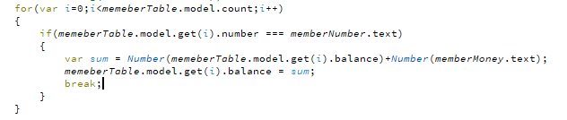 可以看到,我们这个地方写了一个循环,遍历model的所有行,如果哪一行的number等于了我输入的值,则更新它的balance。