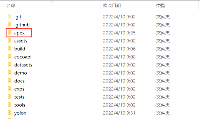 安装成功后,YOLOX文件夹下出现apex文件: